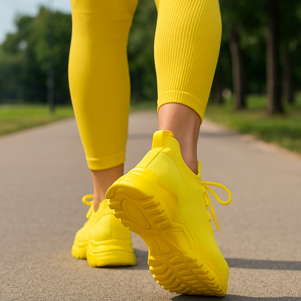 - Summer-bright set meets ultra-light sneakers built for long walks.